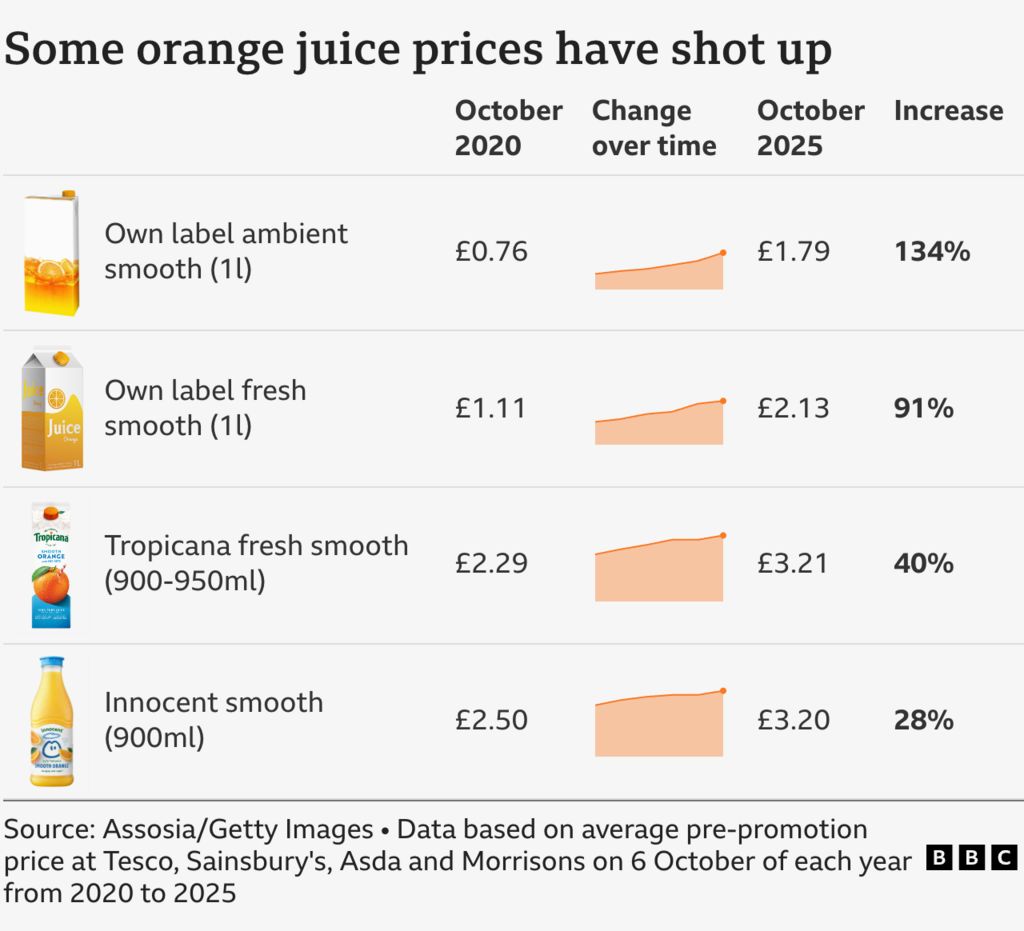 Ціни на апельсиновий сік є не ізольованим випадком, адже спостерігається схожа тенденція і на інших товарах. Щороку споживається приблизно 2.5 мільярди галлонів апельсинового соку, з яких близько десятого частини – у Великій Британії.