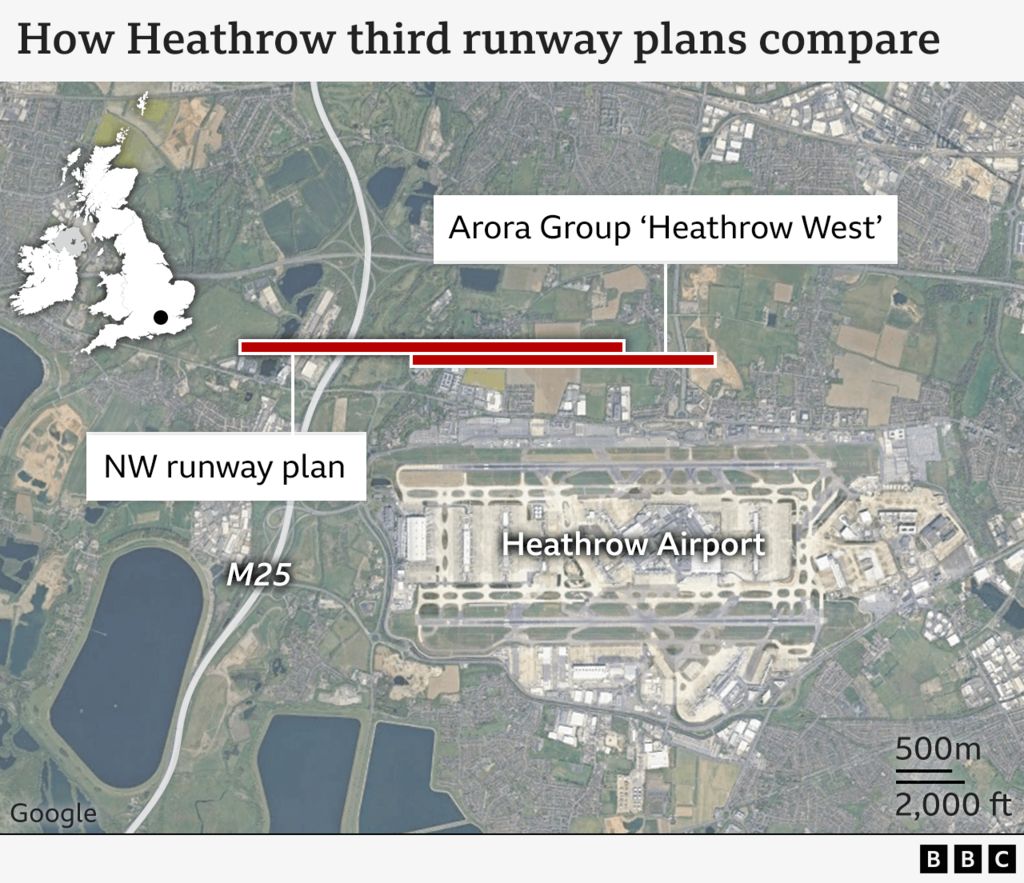 У противагу цьому, пропозиція Arora Group передбачає коротшу смугу та відмову від зміни M25 з нижчою ціною в £25 млрд. Проте, для цього знадобиться додаткова інфраструктура.