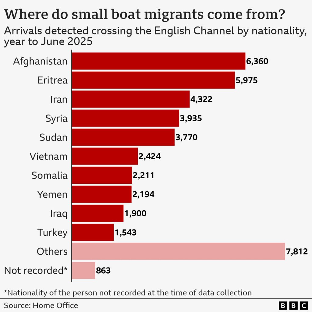 Афганці складають найбільшу національність, що прибуває через цей маршрут у період до червня 2025 року, становлячи 15% усіх прибулих малими човнами (6,400). Другу за чисельністю групу становлять мігранти з Еритреї (5,975), зокрема, люди з Ірану, Сирії, Судану та В’єтнаму.