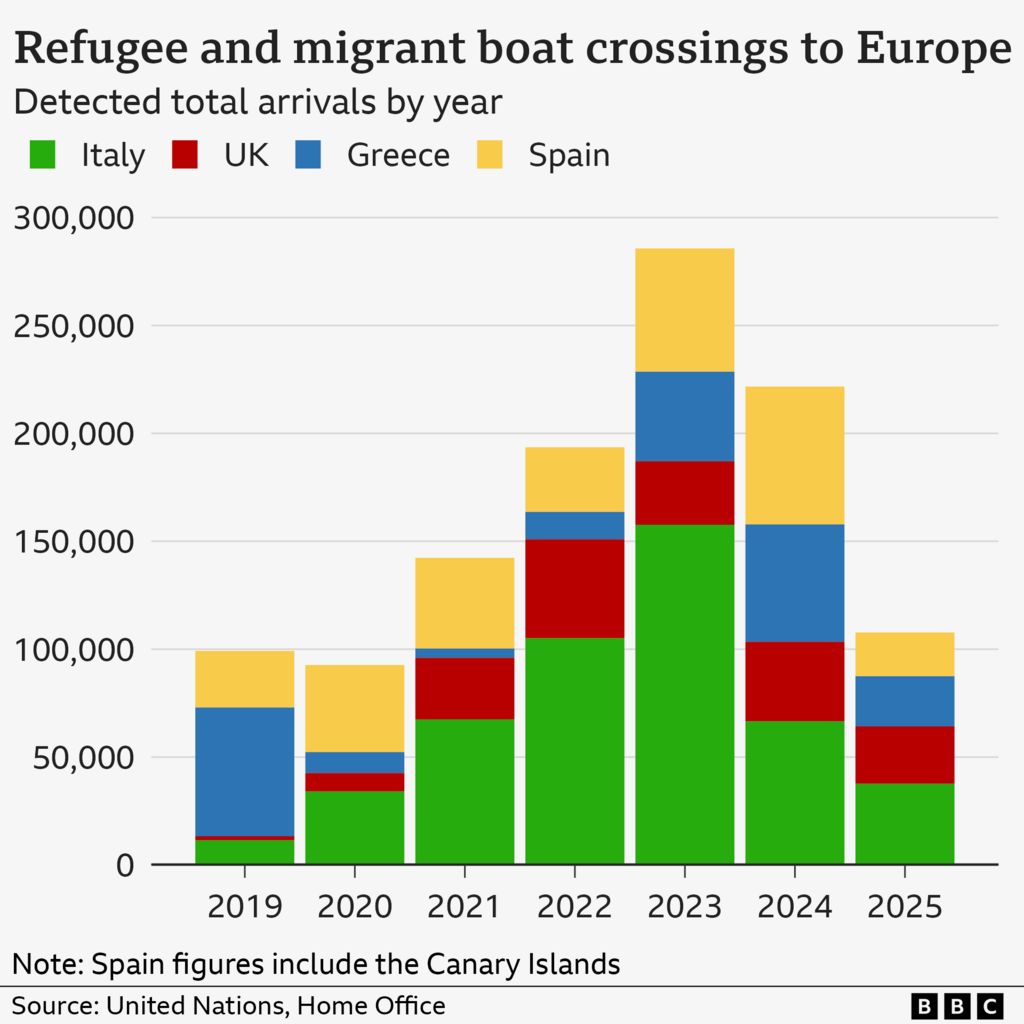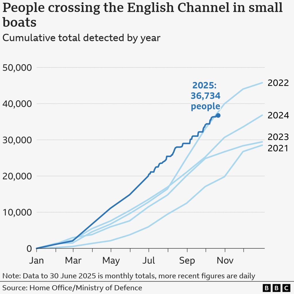 На 21 жовтня 2025 року до Великобританії прибуло 36,734 особи малими човнами. Це на 8,530 більше, ніж на ту ж дату у 2024 році, але на 869 менше, ніж у 2022 році, який став рекордним за кількістю перетинів.