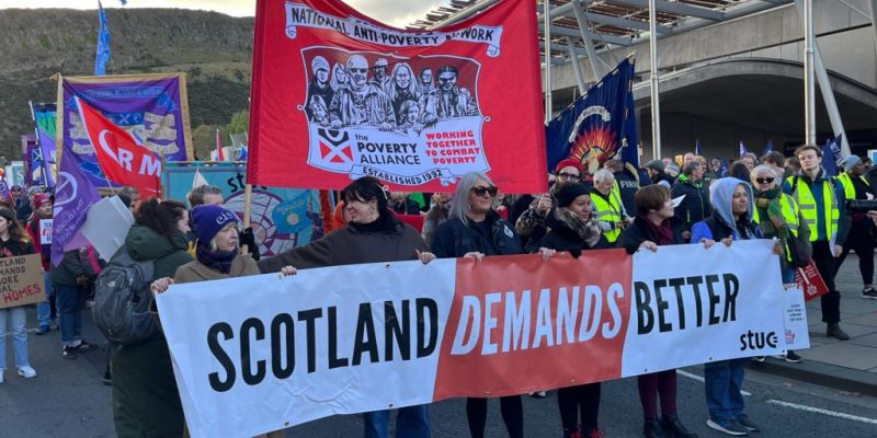 Демонстрацію під назвою “Шотландія вимагає краще” організували профспілки та благодійні організації з метою закликати до активніших дій щодо бідності напередодні бюджету Великобританії та виборів до Шотландського парламенту наступного року.