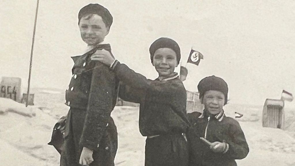 У більш загрозливій манері одна з фотографій демонструє 12-річного Пітера Ейзнера, який усміхається з друзями, а на задньому плані розвівається нацистський прапор.